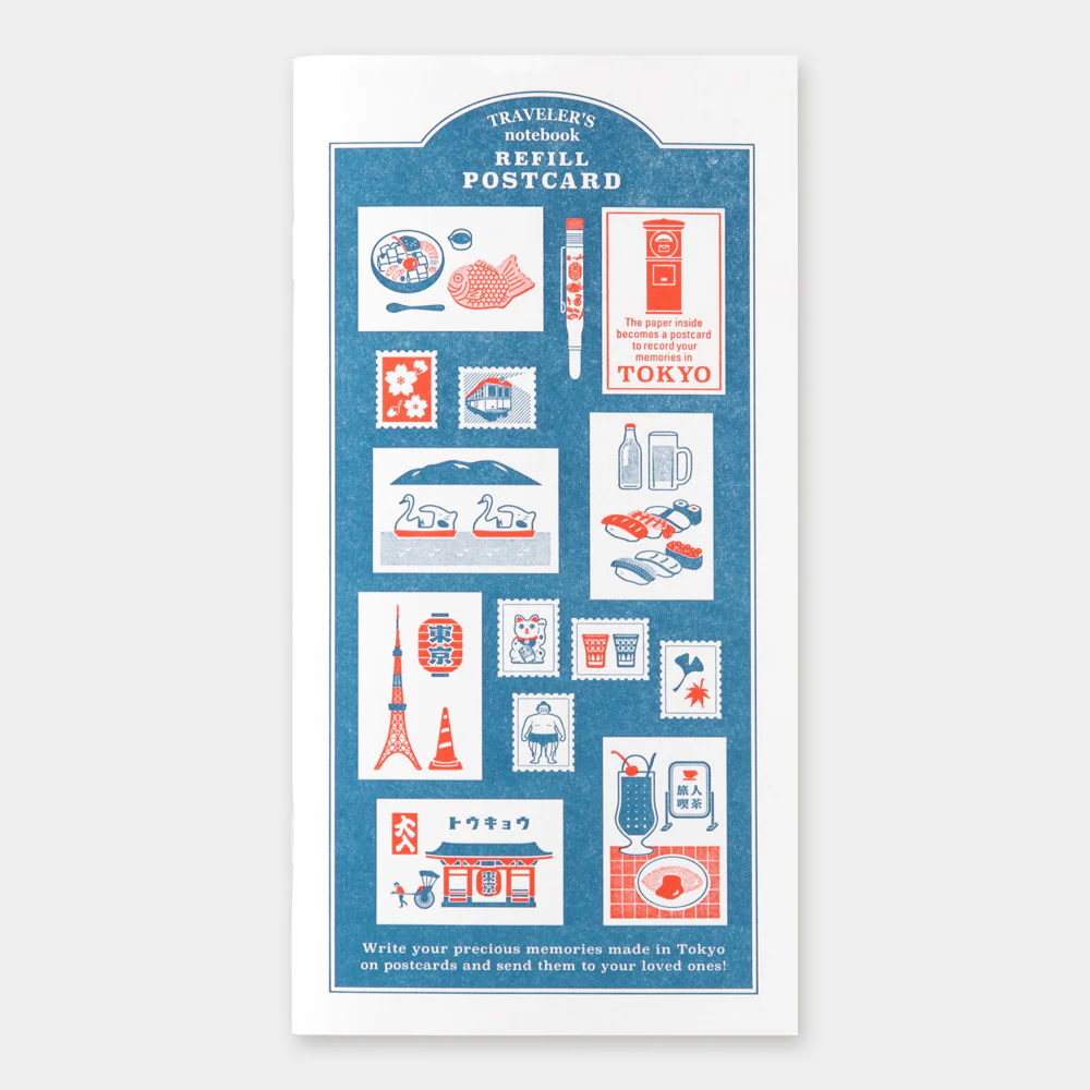 This is TRAVELER’S notebook Refill that is designed with a focus on Tokyo, where TRAVELER’S COMPANY is based. The cover is a letterpress print of a scene encountered during a tour of Tokyo. And all the pages in this refill can be used as postcards by cutting out at the perforation. The paper is made of Watercolor paper, which is thick and ideal for watercolor-type mediums. You can draw the scenery you encountered in your travels around Tokyo, put a stamp on it, or write your memories on it and send it to others. Cut-out postcards can be sent as standard postcards with stamps attached.